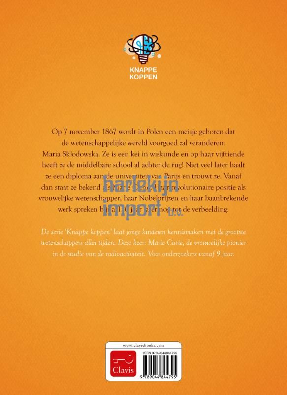 Op 7 november 1867 wordt in Polen een meisje geboren dat de wetenschappelijke wereld voorgoed zal veranderen: Maria Sklodowska. Ze is een kei in wiskunde en op haar vijftiende heeft ze de middelbare school al achter de rug! Niet veel later haalt ze een diploma aan de universiteit van Parijs en trouwt ze. Vanaf dan staat ze bekend als Marie Curie. Haar revolutionaire positie als vrouwelijke wetenschapper, haar Nobelprijzen en haar baanbrekende werk spreken bijna 150 jaar later nog tot de verbeelding. De serie 'Knappe koppen' laat jonge kinderen kennismaken met de grootste wetenschappers aller tijden. Deze keer: Marie Curie, de vrouwelijke pionier in de studie van de radioactiviteit. Voor onderzoekers vanaf 9 jaar.