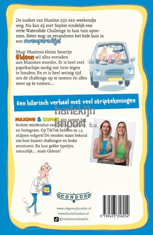 De ouders van Maxime zijn een weekendje weg. Nu kan zij met Sophie eindelijk een vette Waterslide Challenge in hun tuin opnemen. Beter nog: ze veranderen het hele huis in een zwemparadijs! Maar Maximes kleine broertje Gideon wil alles verraden aan Maximes moeder. Er is heel veel paprikachips nodig om hem tegen te houden. En er is heel weinig tijd om de challenge op te nemen én alles weer op te ruimen... Een hilarisch avontuur met glansrollen voor de beroemde typetjes van Maxime & Sophie. Met veel striptekeningen van Jan Vriends, bekend van zijn illustraties voor de Tina.