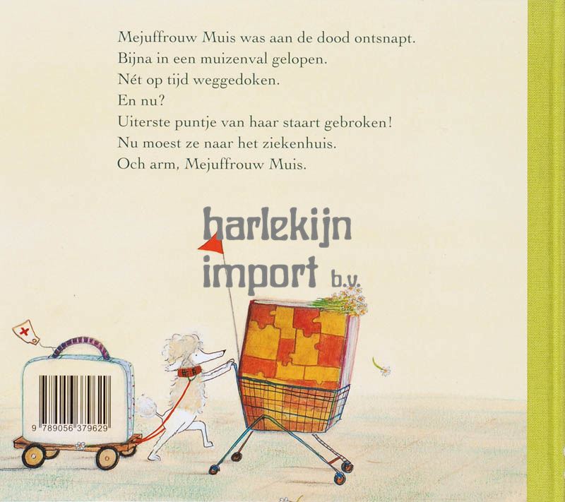Klein prentenboek over Mejuffrouw Muis die bijna in een muizenval loopt. Nu is haar staart gebroken en moet ze een weekje in het ziekenhuis blijven. Lucebert, haar hondje, vindt dat maar niets, maar desondanks vermaken ze zich opperbest. Dan moet Mejuffrouw Muis weer naar huis en vraagt ze aan de dokter wanneer hij haar weer wil zien... Bijzonder aardig en geestig, gedeeltelijk op rijm geschreven, verhaaltje met een onverwachte afloop. De illustraties bestaan uit heel gedetailleerde, in zachte kleuren uitgevoerde, tekeningen waarop heel veel te ontdekken valt. Kinderen zullen dit boekje dan ook vaker dan een keer willen bekijken. De schutbladen staan vol met Mejuffrouw Muis, met verbonden staart, in allerlei situaties. Er zijn meer deeltjes verschenen die onafhankelijk van elkaar te lezen zijn. Vanaf ca. 4 jaar.