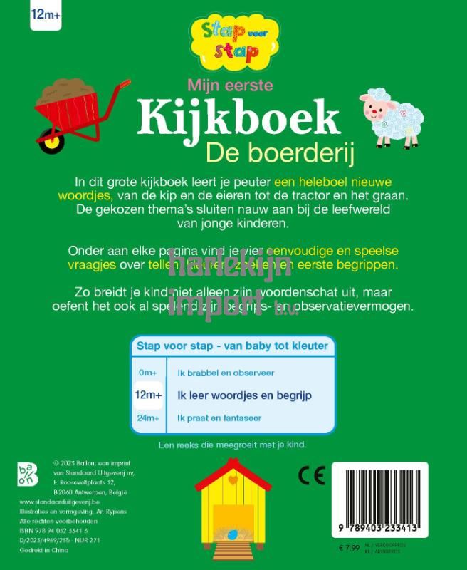 In dit grote kijkboek leert je peuter een heleboel nieuwe woordjes. De gekozen thema’s sluiten nauw aan bij de leefwereld van jonge kinderen.Onder aan elke pagina vind je vier eenvoudige en speelse vraagjes over tellen, kleuren, zoeken en eerste begrippen.Zo breidt je kind niet alleen zijn woordenschat uit, maar oefent het ook al spelend zijn begrips- en observatievermogen.