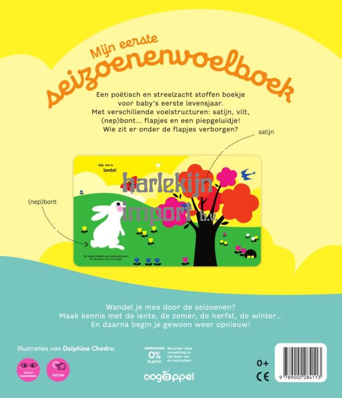 Een poëtisch en streelzacht stoffen boekje voor baby's eerste levensjaar.Met verschillende voelstructuren: satijn, vilt, (nep)bont... flapjes en een piepgeluidje!Wie zit er onder de flapjes verborgen? Wandel je mee door de seizoenen?Maak kennis met de lente, de zomer, de herfst, de winter…En daarna begin je gewoon weer opnieuw!