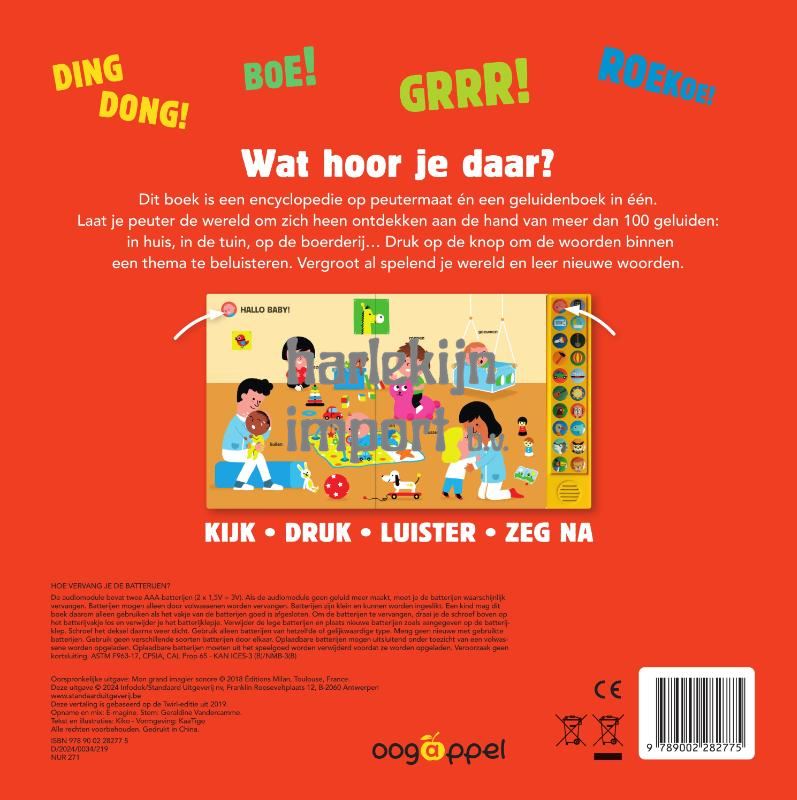 Dit boek is een encyclopedie op peutermaat én een geluidenboek in één.Laat je peuter de wereld om zich heen ontdekken aan de hand van meer dan 100 geluiden: in huis, in de tuin, op de boerderij… Druk op de knop om de woorden binnen een thema te beluisteren. Vergroot al spelend je wereld en leer nieuwe woorden.