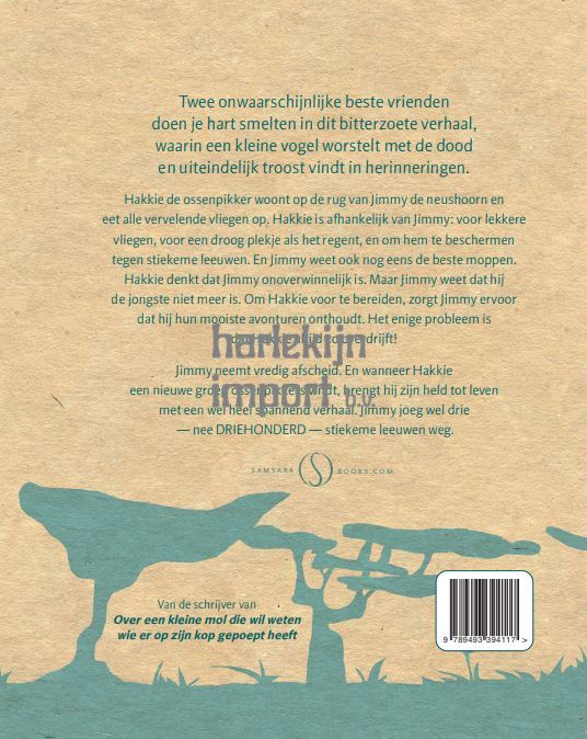 Twee onwaarschijnlijke beste vrienden doen je hart smelten in dit bitterzoete verhaal, waarin een kleine vogel worstelt met de dood en uiteindelijk troost vindt in herinneringen. Hakkie de ossenpikker woont op de rug van Jimmy de neushoorn en eet alle vervelende vliegen op. Hakkie is afhankelijk van Jimmy: voor lekkere vliegen, voor een droog plekje als het regent, en om hem te beschermen tegen stiekeme leeuwen. En Jimmy kent ook nog eens de beste moppen. Hakkie denkt dat Jimmy onoverwinnelijk is. Maar Jimmy weet dat hij de jongste niet meer is. Om Hakkie voor te bereiden, zorgt Jimmy ervoor dat hij hun mooiste avonturen onthoudt. Het enige probleem is dat Hakkie altijd zo overdrijft! Jimmy neemt vredig afscheid op zes woordeloze pagina’s. En wanneer Vogel een nieuwe groep ossenpikkers vindt, brengt hij zijn held tot leven met een wel heel spannend verhaal. Jimmy joeg wel drie — nee DRIEHONDERD — stiekeme leeuwen weg.