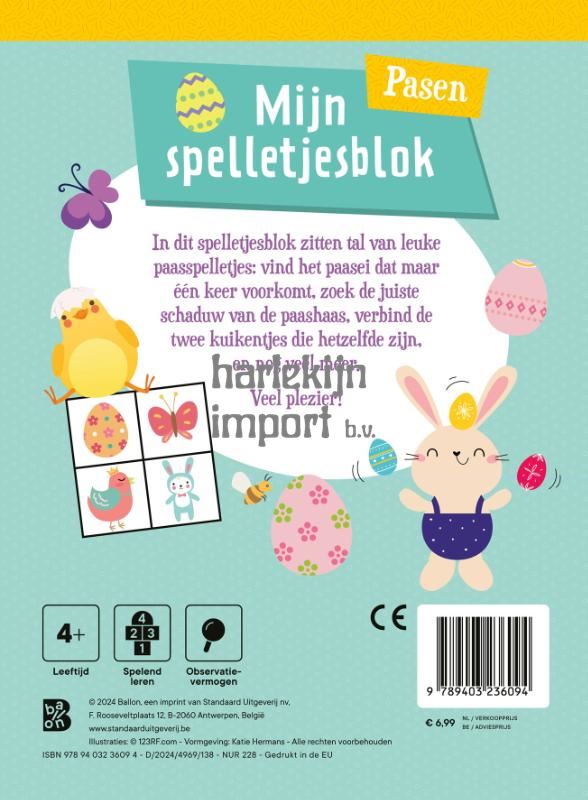 In dit spelletjesblok zitten tal van leuke paasspelletjes: vind het paasei dat maar één keer voorkomt, zoek de juiste schaduw van de paashaas, verbind de twee kuikentjes die hetzelfde zijn, en nog veel meer. Veel plezier!