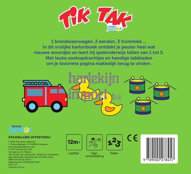 1 brandweerwagen, 2 eenden, 3 trommels... In dit vrolijke kartonboek leren peuters heel wat nieuwe woordjes en tellen ze van 1 tot 5 met de tekeningen uit hun favoriete tv-programma. Door de tabbladen vinden ze hun favoriete pagina makkelijk terug. En wie het tellen beu is, kan zich vermaken met de leuke zoekvraagjes op elke spread.