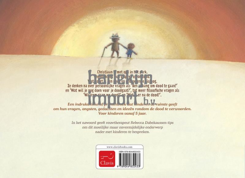 Een mooie dag. Christiaan en Opa zijn in het park. Ze filosoferen over grote en kleine vragen. Waarom gaan we dood? Wat is er na de dood? En moet je bang zijn voor de dood? Dit boek nodigt uit tot een gesprek over de dood én geeft kinderen de ruimte om vragen, angsten en gedachten te verwoorden. Voor kinderen vanaf 5 jaar.