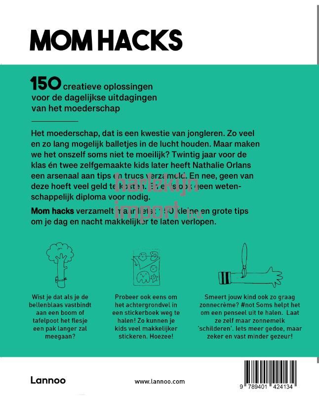 Het moederschap, dat is een kwestie van jongleren. Zoveel en zolang mogelijk balletjes in de lucht houden. Maar maken we het onszelf soms niet te moeilijk? Twintig jaar voor de klas én twee zelfgemaakte kids later heeft Nathalie Orlans een arsenaal aan tips en trucs verzameld. En nee, geen van deze hoeft veel geld te kosten. En nee, geen enkele van deze veronderstelt een wetenschappelijk diploma. Mom hacks verzamelt maar liefst 150 mom hacks: kleine en grote tips om je dag en nacht makkelijker te laten verlopen. Wist je dat als je bellenblaas vastbindt aan een boom of tafelpoot het flesje een pak langer zal meegaan? Probeer ook eens om het achtergrondvel in een stickerboek weg te halen! Zo kunnen je kids veel makkelijker stickeren. Hoezee! Smeert jouw kind ook zo graag zonnecrème? #not Soms helpt het om een verfborstel uit te halen. Of beter gezegd: een penseel. Laat ze zelf maar zonnemelk 'schilderen'. Iets meer gedoe, maar zeker en vast minder gezeur!