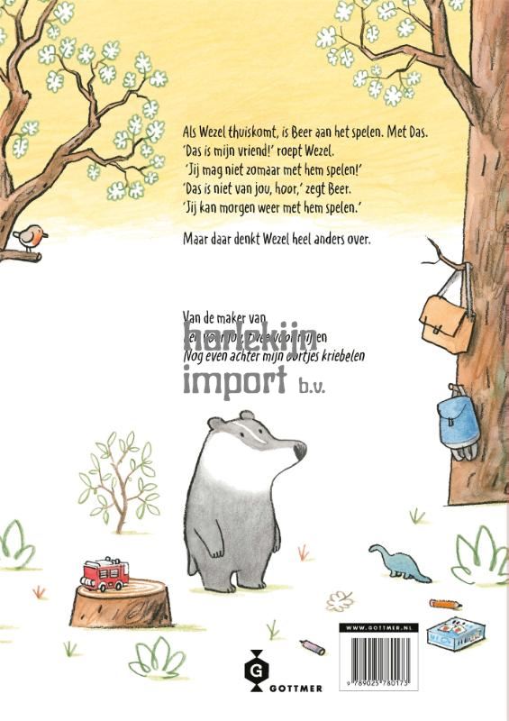 'Morgen ben ik de baas' is een heerlijk eigenwijs verhaal over samen spelen, van maker Jörg Mühle van 'Eén voor jou, twee voor mij'. Hoofdpersonen Wezel en Beer ontdekken dat dit moeilijker is dan gedacht. Bij thuiskomst kan Wezel zijn ogen niet geloven: Beer en Das zijn samen aan het spelen. Wezel voelt zich buitengesloten omdat Das zijn vriend is. Ondanks de pogingen van Das om de situatie te sussen en voor te stellen om gewoon met z'n drieën te spelen, kunnen Beer en Wezel het niet eens worden, zelfs niet over simpele spellen zoals vader en moedertje spelen, voetbal, memory of verstoppertje. 'Je wilt altijd de baas zijn!' zegt Wezel. 'Er valt met jou niet te spelen!' zegt Beer. Dan moet Das naar huis... Het delen van een beste vriendje kan best lastig zijn. Lukt het hen om samen te spelen en te beslissen welk spel er wordt gespeeld? In 'Morgen ben ik de baas' laat Jörg Mühle zien dat hij de strubbelingen van kleuters heel goed begrijpt. Het eigenwijze prentenboek is geschikt voor kinderen vanaf 3 jaar. De populaire Duitse kinderboekenschrijver Jörg Mühle is bekend van de immens populaire en lieve peuterboekjesserie over Klein Konijn, dat bestaat uit de volgende delen: 'Nog even samen spelen', 'Nog even mijn haartjes wassen', 'Nog even achter mijn oortjes kriebelen' en 'Nog even een kusje erop'. Zijn prentenboek 'Eén voor jou, twee voor mij' werd genomineerd voor de Deutscher Jugendliteraturpreis en in Nederland stond het in de Prentenboek Top 10 tijdens de Nationale Voorleesdagen.