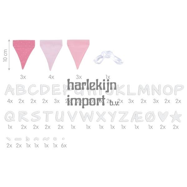 Naamslinger, roos, met 10 wimpels. 150 cm. wimpel: 7,5x10 cm.