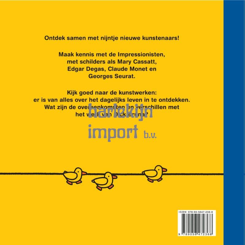 Ontdek samen met nijntje nieuwe kunstenaars! In dit boek laat nijntje je schilderijen zien van de Impressionisten. Maak kennis met schilders als Mary Cassatt, Edgar Degas, Claude Monet en Georges Seurat. Deze kunstenaars keken heel goed naar de wereld om zich heen en lieten zich inspireren door het dagelijks leven. Ook Dick Bruna werd geïnspireerd door de wereld om hem heen. Kijk goed naar de kunstwerken in dit boek. Op het eerste gezicht lijken ze niet op de tekeningen van Dick Bruna, maar als je de tijd neemt, ga je ook overeenkomsten zien. Ontdek nieuwe manieren om naar kunst te kijken en laat je inspireren! In 2026 is het 100 jaar geleden dat zowel Claude Monet als Mary Cassatt overleed. De eerste titel uit deze serie is nog steeds leverbaar: nijntje en de kunstenaars. Het kreeg bij de Junior Design Awards in Engeland de prijs voor Best Designed/Illustrated Book for Children (Factual). Copyrightvermelding Cover: Illustraties Dick Bruna © copyright Mercis bv, 1953-2026. Georges Seurat, Baders bij Asnières, 1884. The National Gallery, Londen/Scala, Florence