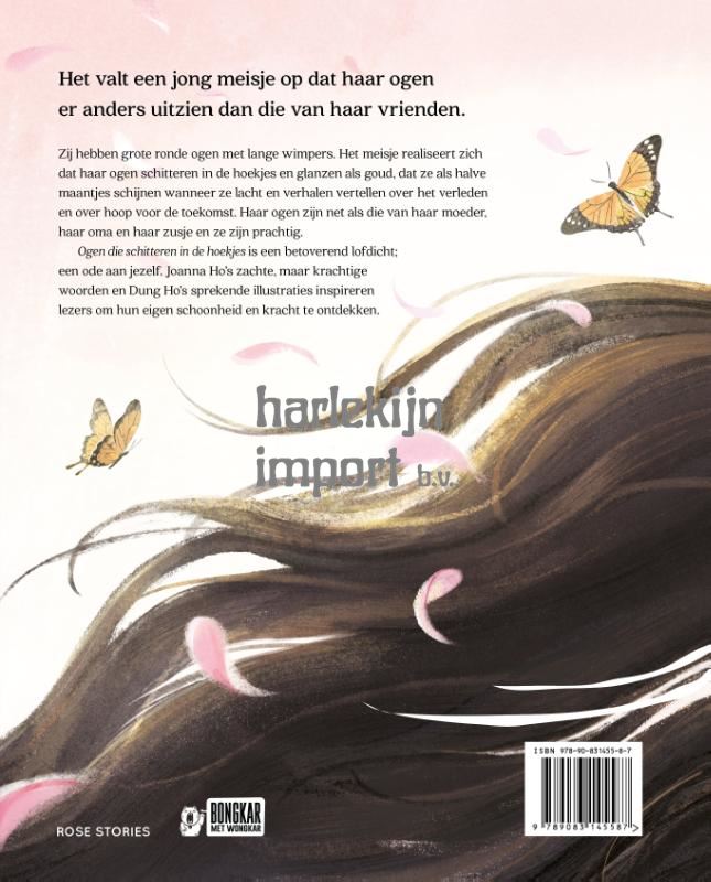 Het valt een jong meisje op dat haar ogen er anders uitzien dan die van haar vrienden. Zij hebben grote ronde ogen en lange wimpers. Het meisje realiseert zich dat haar ogen schitteren in de hoekjes en glanzen als goud, dat ze als halve maantjes schijnen wanneer ze lacht en verhalen vertellen over het verleden en over hoop voor de toekomst. Haar ogen zijn net als die van haar moeder, haar oma en haar zusje en ze zijn prachtig. Ogen die schitteren in de hoekjes is een betoverend lofdicht: een ode aan jezelf. Joanna Ho's zachte, maar krachtige woorden en Dung Ho's sprekende illustraties inspireren lezers om hun eigen schoonheid en kracht te ontdekken.