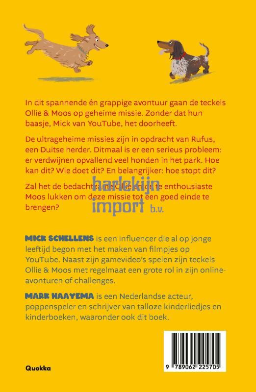 In dit spannende én grappige avontuur gaan de teckels Ollie & Moos op geheime missie. Zonder dat hun baasje, Mick van YouTube, het doorheeft. De ultrageheime missies zijn in opdracht van Rufus, een Duitse herder. Ditmaal is er een serieus probleem: er verdwijnen opvallend veel honden in het park. Hoe kan dit? Wie doet dit? En belangrijker: hoe stopt dit? Zal het de bedachtzame Ollie en de te enthousiaste Moos lukken om deze missie tot een goed einde te brengen?