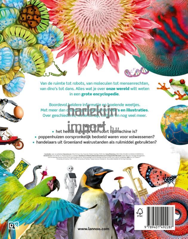 Van de ruimte tot robots, van moleculen tot mensenrechten, van dino's tot dans. Alles wat je over onze wereld wilt weten in een grote encyclopedie. Boordevol heldere informatie en boeiende weetjes. Met meer dan duizend gedetailleerde foto's en illustraties. Over geschiedenis, wetenschap, cultuur en nog veel meer. Wist je dat: het heelal eigenlijk een soort tijdmachine is? poppenhuizen oorspronkelijk bedoeld waren voor volwassenen? handelaars uit Groenland walrustanden als ruilmiddel gebruikten?