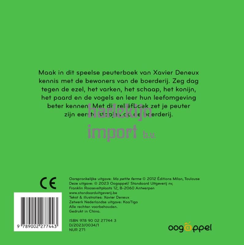 Maak in dit speelse peuterboek van Xavier Deneux kennis met de bewoners van de boerderij. Zeg dag tegen de ezel, het varken, het schaap, het konijn, het paard en de vogels en leer hun leefomgeving beter kennen. Met dit reliëfboek zet je peuter zijn eerste stapjes op de boerderij.