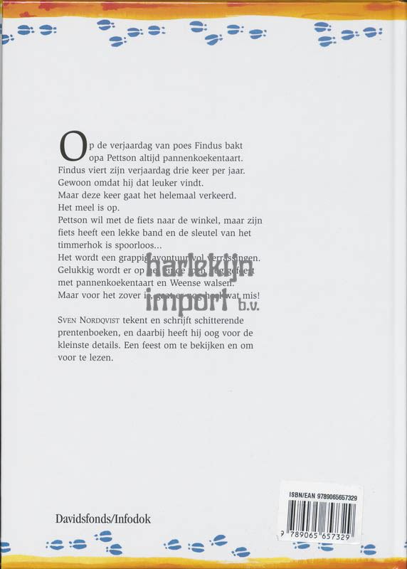 Op de verjaardag van poes Findus bakt opa Pettson altijd pannenkoekentaart. Findus viert zijn verjaardag drie keer per jaar. Gewoon omdat hij dat leuker vindt. Maar deze keer gaat het helemaal verkeerd. Het meel is op. Pettson wil met de fiets naar de winkel, maar zijn fiets heeft een lekke band en de sleutel van het timmerhok is spoorloos… Het wordt een grappig avontuur vol verrassingen. Gelukkig wordt er op het einde toch nog gefeest met pannenkoekentaart en Weense walsen. Maar voor het zover is, gaat er nog heel wat mis! Sven Nordqvist tekent en schrijft schitterende prentenboeken, en daarbij heeft hij oog voor de kleinste details. Een feest om te bekijken en om voor te lezen.