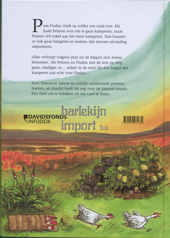 Poes Findus vindt op zolder een oude tent. Hij haalt opa Pettson over om te gaan kamperen, maar Pettson wil enkel aan het meer kamperen. Dan kunnen ze ook gaan hengelen en meteen de nieuwe uitvinding van Pettson uitproberen. Alles verloopt volgens plan, tot de kippen zich ermee bemoeien. Als Pettson en Findus met de tent op weg gaan, eindigen ze… achteraan in de tuin! En dan begint het kamperen pas echt voor Findus…