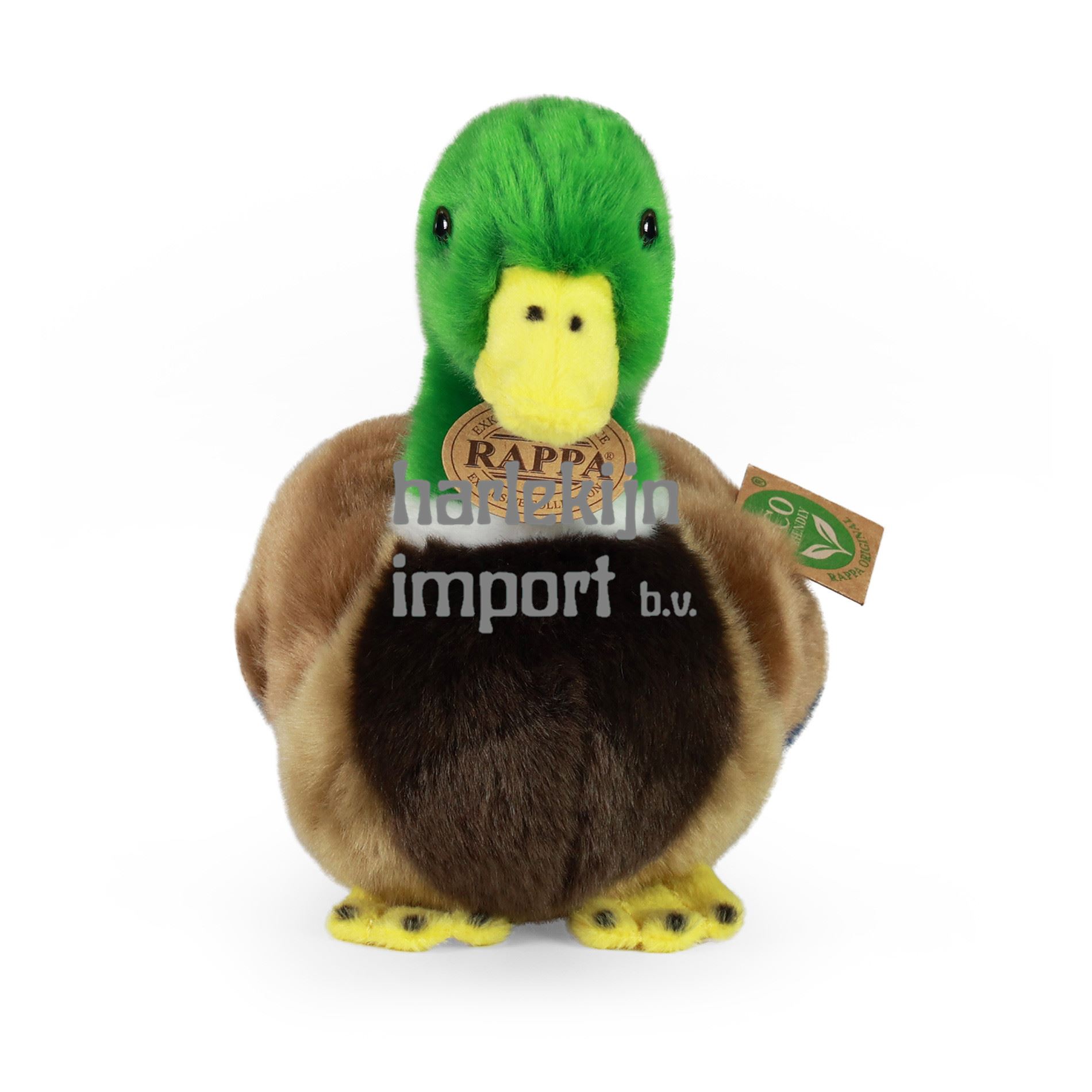 De pluche eend met een afmeting van 20 cm is gemaakt van hoogwaardig, fijn pluche en maakt daarmee deel uit van de exclusieve collectie knuffels RAPPA. We hebben besloten om de groene weg te gaan, die zo milieuvriendelijk mogelijk is - de ECO-VRIENDELIJKE weg. Wat betekent ECO-FRIENDLY eigenlijk? De vulling van de knuffel is gemaakt van gerecyclede PET-flessen. Dit materiaal is volkomen veilig, niet te onderscheiden van de standaard vulling en volledig gecertificeerd voor de veiligheid van zelfs de allerkleinsten.