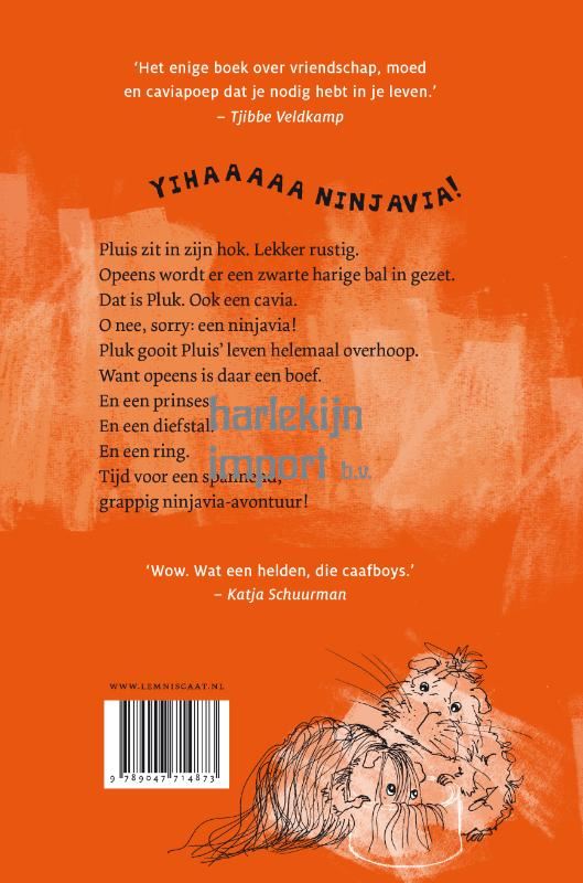 Yihaaaaaaa ninjavia! Een fantastisch komisch boek voor sterke eerste lezers Er is een ramp gebeurd. De ring van prinses Miski is gestolen. Maar dat terzijde. Want om te beginnen is daar Pluis. Pluis leidt een rustig leventje in zijn caviakooi als er opeens een zwarte, harige bal in wordt gezet. Dat is Pluk. Ook een cavia. O nee, sorry: een ninjavia! Pluk gooit Pluis’ leven helemaal overhoop. Hij is niet bang voor Sis de kat, durft de kooi uit en laat Pluis ziet dat er een BUITEN is. Maar waarom is Pluk soms opeens zo stil? Waar komt hij eigenlijk vandaan? En wat heeft zijn verleden met de ring te maken? Eén ding is zeker: het is tijd voor ninjavia-actie. Zelfs voor Pluis, of die nu wil of niet. Lezers zullen hardop lachen bij de avonturen – en vrolijke tekeningen – van Pluk en Pluis. Komt het goed met de ring? En met Pluk en Pluis? En met de prinses en de prins? Gelukkig is het een heerlijk dik boek en komen er nog meer verhalen!