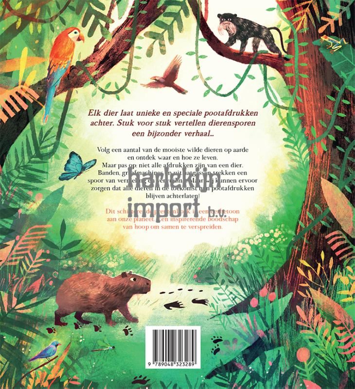 Elk dier laat unieke en speciale pootafdrukken achter. Stuk voor stuk vertellen dierensporen een bijzonder verhaal… Volg een aantal van de mooiste wilde dieren op aarde en ontdek waar en hoe ze leven. Maar pas op: niet alle afdrukken zijn van een dier. Banden, graafmachines en uitlaatgassen trekken een spoor van vernieling en vervuiling. Maar wij kunnen ervoor zorgen dat alle dieren in de toekomst hun pootafdrukken blijven achterlaten! Dit schitterende prentenboek is een eerbetoon aan onze planeet. Een inspirerende boodschap van hoop om samen te verspreiden.