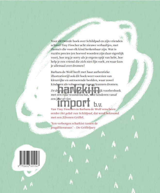 Voor dit tweede boek over Schildpad en zijn vrienden schreef Tiny Fisscher acht nieuwe verhaaltjes, met thema’s die voor elk kind herkenbaar zijn. Wat is ruziën precies (en hoeveel woorden zijn daar eigenlijk voor), hoe zeg je sorry als je ergens spijt van hebt, hoe help je een vriend die zich niet fijn voelt, en waar kun je allemaal over dromen? Barbara de Wolf heeft met haar authentieke illustratiestijl ook dit boek weer voorzien van kleurrijke en ontroerende beelden, waar zowel kinderen als volwassenen in weg kunnen dromen. 'De droom van Schildpad' is een heerlijk voorleesboek met een rijke woordenschat, voor kinderen vanaf een jaar of vier. Het boek kan ook als opstap worden gebruikt voor filosofische gesprekken, thuis of in de klas. Van Tiny Fisscher en Barbara de Wolf verscheen eerder 'Het geluk van Schildpad', dat werd bekroond met een Zilveren Griffel. ‘Een verborgen schatkist tussen de jeugdliteratuur.’ – De Griffeljury