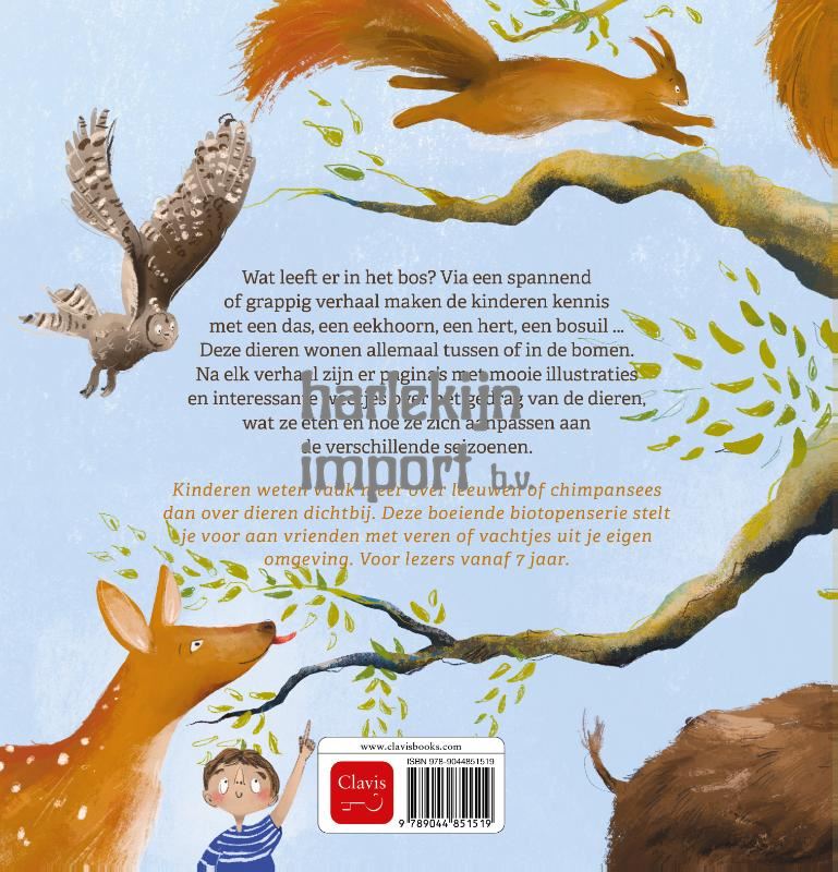 Wat leeft er in het bos? Via een spannend of grappig verhaal maken de kinderen kennis met een wild zwijn, een eekhoorn, een hert, een bosuil ? Deze dieren wonen allemaal tussen of in de bomen in het bos. Na elk verhaal zijn er pagina’s met mooie illustraties en interessante weetjes over het gedrag van de dieren, wat ze eten en hoe ze zich aanpassen aan de verschillende seizoenen. Kinderen weten vaak meer over leeuwen of chimpansees dan over dieren dichtbij. Deze boeiende biotopenserie stelt je voor aan vrienden met veren of vachtjes uit je eigen omgeving. Voor lezers vanaf 7 jaar.
