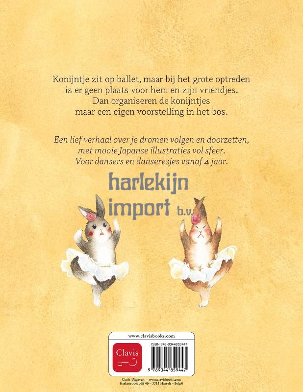 Konijntje zit op ballet, maar bij het grote optreden is er geen plaats voor hem en zijn vriendjes. Dan organiseren de konijntjes maar een eigen voorstelling in het bos. Een lief verhaal over je dromen volgen en doorzetten, met mooie Japanse illustraties vol sfeer. Voor dansers en danseresjes vanaf 4 jaar.