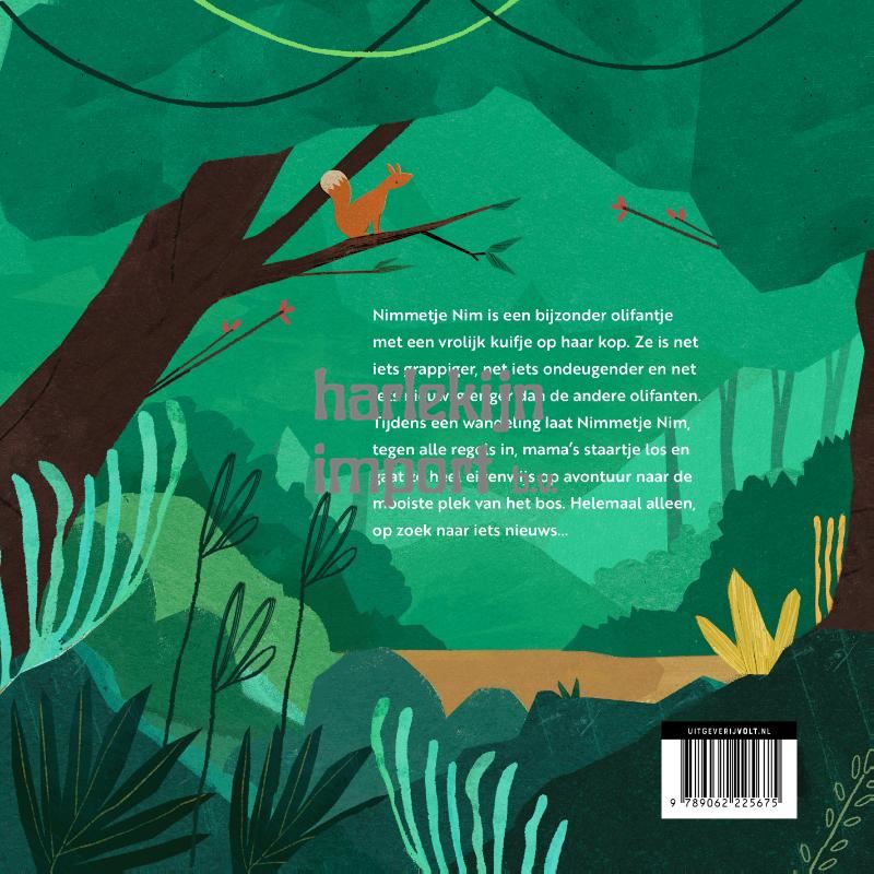 Nimmetje Nim is een bijzonder olifantje met een vrolijk kuifje op haar kop. Ze is net iets grappiger, net iets ondeugender en net iets nieuwsgieriger dan de andere olifanten. Tijdens een wandeling laat Nimmetje Nim, tegen alle regels in, mama’s staartje los. Ze gaat heel eigenwijs achter een prachtige kolibrie aan en vindt de mooiste plek van het bos. Een prachtig meer met een regenboog van kleuren die ze zelf tevoorschijn tovert met haar slurf. Mama is trots op haar eigenwijze Nimmetje, want die nieuwsgierigheid maakt haar juist zo bijzonder. En haar kuifje natuurlijk! Olifantje in het bos is een speels prentenboek over de kracht van anders zijn.