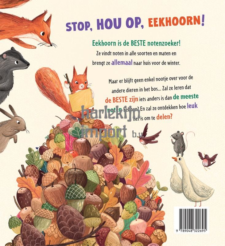 STOP, HOU OP, EEKHOORN! Eekhoorn is de BESTE notenzoeker! Ze vindt noten in alle soorten en maten en brengt ze allemaal naar huis voor de winter. Maar er blijft geen enkel nootje over voor de andere dieren in het bos... Zal ze leren dat de BESTE zijn iets anders is dan de meeste noten hebben? E zal ze ontdekken hoe leuk het is om te delen?