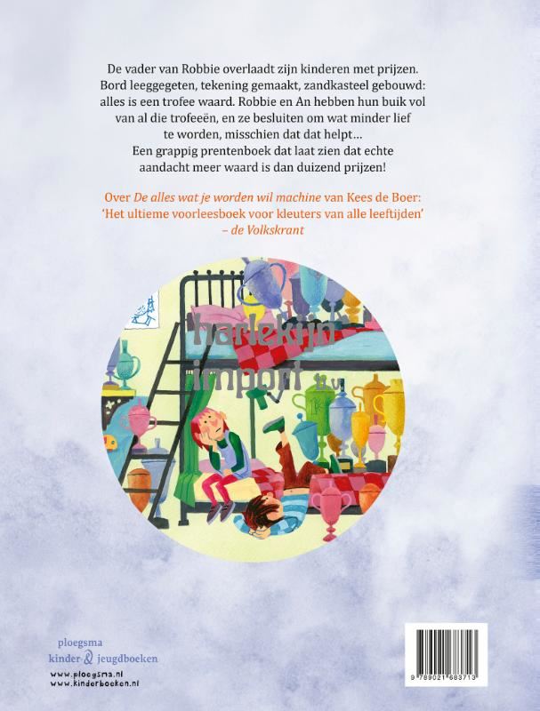 De vader van Robbie en An is trots op zijn kinderen. Erg trots. Héél erg trots. Voor alles wat ze doen, geeft hij ze een prijs. Bord leeggegeten, tekening gemaakt, legokasteel gebouwd: alles is een trofee waard. Robbie en An hebben hun buik vol van al die trofeeën, en ze besluiten om wat minder lief te worden, misschien dat dathelpt…Een grappig prentenboek dat laat zien hoe beloningen niks meer waard zijn wanneer je iemand er compleet mee overstelpt.