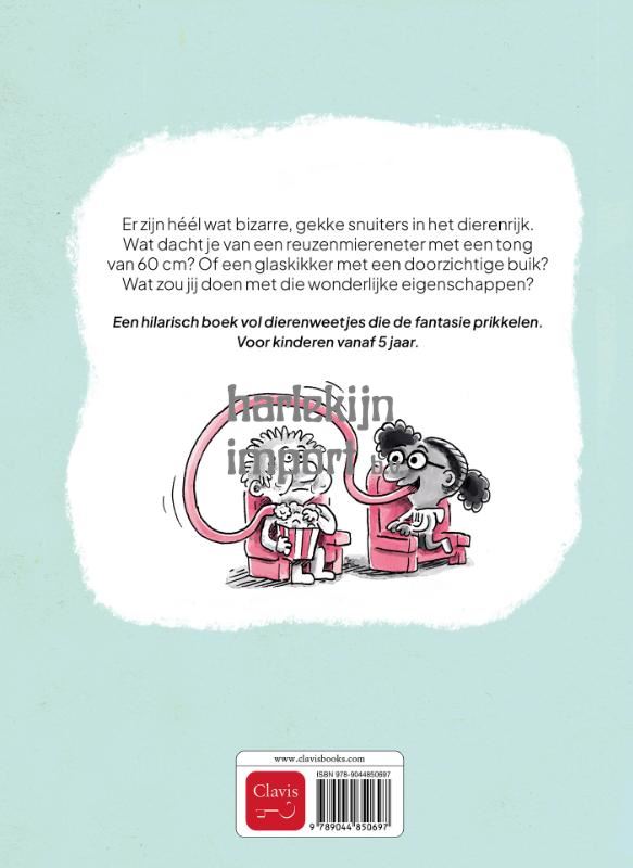 Er zijn héél wat bizarre, gekke snuiters in het dierenrijk. Wat dacht je van een reuzenmiereneter met een tong van 60 cm? Of een glaskikker met een doorzichtige buik? Wat zou jij doen met die wonderlijke eigenschappen? Een hilarisch boek vol dierenweetjes die de fantasie prikkelen. Voor kinderen vanaf 5 jaar.