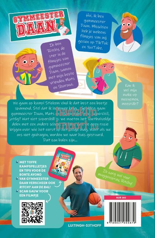 Na Ritchy aan de bal! is er nu een tweede, los te lezen jeugdboek van Gymmeester Daan. Ritchy en zijn vrienden Mats en Sharona gaan op schoolkamp en komen voor nieuwe uitdagingen te staan. Maar hoe los je die sportief op? Met fullcolourillustraties van Paco Vink en QR-codes naar beweegchallenges van Gymmeester Daan. Ritchy vindt het spannend om op schoolkamp te gaan. Hij geniet van de kampspelletjes en de avonturen in het bos, maar hij worstelt met heimwee. Intussen krijgt zijn klas ruzie met de kinderen van een andere school in het kampgebouw ernaast. Tijdens een uitje loopt de ruzie tussen de twee groepen hoog op. Maar als Ritchy geblesseerd raakt, biedt een jongen van de andere school hem de helpende hand. Ritchy begrijpt dat je door aardig te zijn soms meer kunt bereiken en hij nodigt hem uit voor de bonte avond. Intussen is hij verliefd op Sharona geworden, maar is zij ook op hem? 'Een heerlijk verhaal, bomvol toffe en kleurrijke illustraties van Paco Vink (...). School, vriendschap, maar ook oog hebben voor de ander is een mooi thema in dit boek. (...) Aanrader!' Margreet Nap, Boekhandel Jaspers