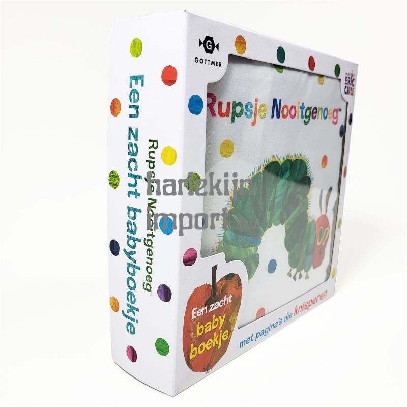 Met 'Rupsje Nooitgenoeg - stoffen boekje' kunnen baby's vanaf 6 maanden al genieten van het klassieke Rupsje Nooitgenoeg-verhaal in vereenvoudigde vorm, maar met net zoveel mooie kleuren, vormen en de geliefde illustraties. Als je op zoek bent naar een leuke en interactieve manier om je baby te helpen bij het leren en ontwikkelen van de fijne motoriek, dan is een stoffen boek voor baby's een uitstekende keuze. Het zachte en veilige boekje is perfect voor grijpgrage babyhandjes: ze zullen het niet snel los willen laten. Het babyboekje is verpakt in een mooie cadeaudoos, kortom: het perfecte kraamcadeau! Rupsje Nooitgenoeg is het bekendste en meest geliefde karakter van schrijver en tekenaar Eric Carle. Hoewel het gelijknamige, iconische prentenboek al meer dan 50 jaar geleden verscheen, staat het nog altijd bij heel veel mensen in de boekenkast. En dat is niet verwonderlijk: de heldere collage-illustraties zijn samen met het vrolijke verhaal nog steeds een feest om te lezen.