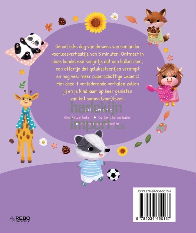 Geniet elke dag van de week van een ander voorleesverhaaltje van 5 minuten. Ontmoet in deze bundel een konijntje dat aan ballet doet, een ottertje dat gelukssteentjes verstopt en nog veel meer superschattige wezens! Met deze 7 vertederende verhalen zullen jij en je kind keer op keer genieten van het samen (voor)lezen.