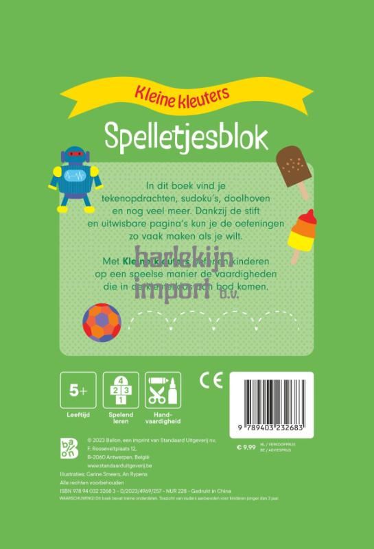 Dit spelletjesblok neem je dankzij zijn handige formaat overal mee naartoe. Er zitten tal van leuke opdrachten in: leren tekenen, doolhoven, stippellijnen overtrekken, sudoku’s… Er zit een stiftje met wisser bij. Dankzij de uitwisbare pagina’s kunnen kinderen zo vaak herbeginnen als ze willen.