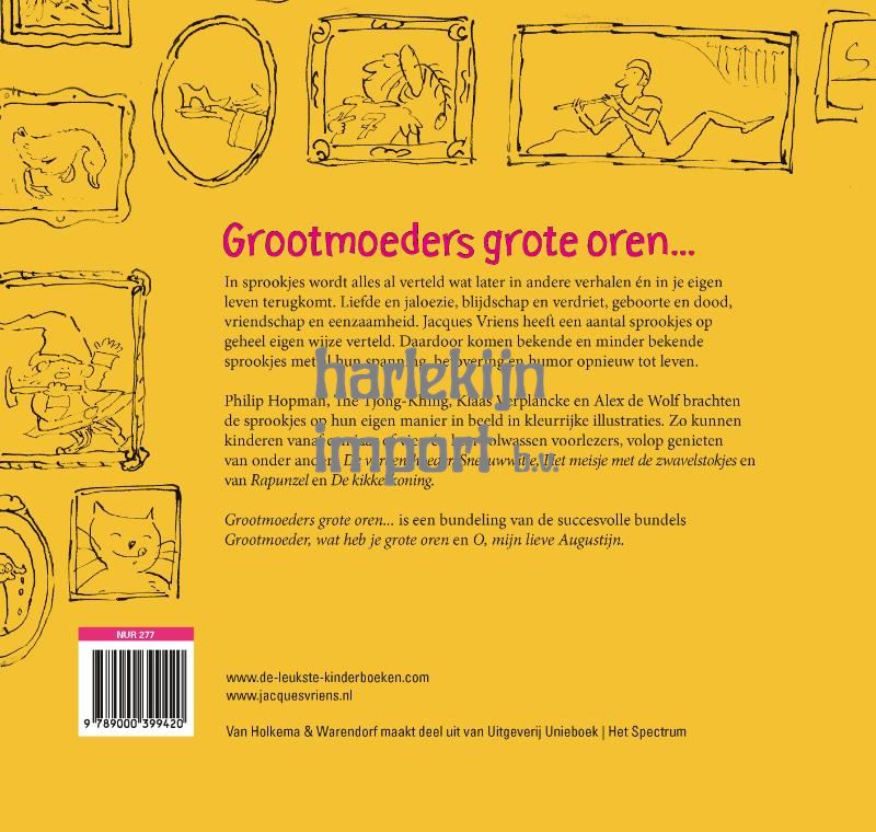 Deze bestseller van meesterverteller Jacques Vriens is opnieuw leverbaar! Sprookjes maken deel uit van onze jeugd: wie werd er niet voorgelezen door zijn ouders of opa of oma? Lekker veilig griezelen en wegdromen met bijvoorbeeld De wolf en de zeven geitjes, De rattenvanger van Hamelen, Assepoester en Vrouw Holle. Klassieke sprookjes zijn echter niet altijd begrijpelijk voor kinderen. Jacques Vriens vertelt sprookjes als geen ander en voor Grootmoeders grote oren... bewerkte hij ze speciaal voor kinderen vanaf 4 jaar. Dat betekent bekende en minder bekende sprookjes in begrijpelijke taal voor kleuters, in de vertrouwde stijl van een van onze grootste kinderboekenschrijvers.
