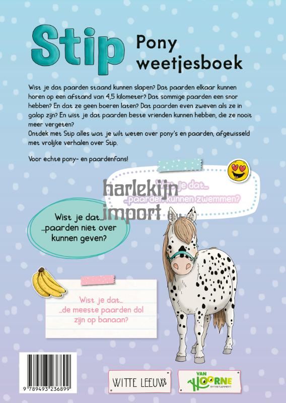 Wist je dat paarden staand kunnen slapen? Paarden elkaar kunnen horen op een afstand van 4,5 kilometer? Dat sommige paarden een snor hebben? Of dat paarden niet kunnen overgeven? Ontdek met Stip de leukste, grappigste en interessantste weetjes over pony’s en paarden, afgewisseld met vrolijke verhalen over Stip. Voor echte pony- en paardenfans!