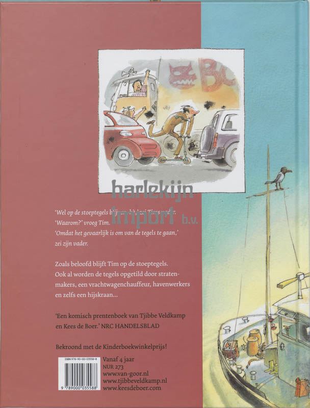 'Wel op de stoeptegels blijven, hè,' zei Tims vader. 'Waarom?' vroeg Tim. 'Omdat het gevaarlijk is om van de tegels te gaan,' zei zijn vader. Zoals beloofd blijft Tim op de stoeptegels. Ook al worden de tegels opgetild door straten - makers, een vrachtwagenchauffeur, havenwerkers en zelfs een hijskraan...