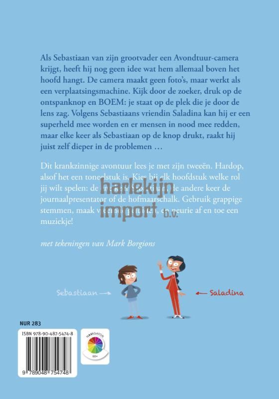 Als Sebastiaan van zijn grootvader een Avondtuur-camera krijgt, heeft hij nog geen idee wat hem allemaal boven het hoofd hangt. De camera maakt geen foto’s, maar werkt als een verplaatsingsmachine. Kijk door de zoeker, druk op de ontspanknop en BOEM: je staat op de plek die je door de lens zag. Volgens Sebastiaans vriendin Saladina kan hij er een superheld mee worden en er mensen in nood mee redden, maar elke keer dat Sebastiaan op de knop drukt, raakt hij juist zelf dieper in de problemen ... Dit krankzinnige avontuur lees je met zijn tweeën. Hardop, alsof het een toneelstuk is. Kies bij elk hoofdstuk welke rol jij wilt spelen: de ene keer Sebastiaan Krokmonseur met zijn Avondtuur-camera, de andere keer journaalpresentator Arend-Jan Remoelade of hofmaarschalk Eleonore Makkaron-Krepsuzet. Gebruik grappige stemmetjes, maak vreemde geluiden, en neurie af en toe een muziekje!