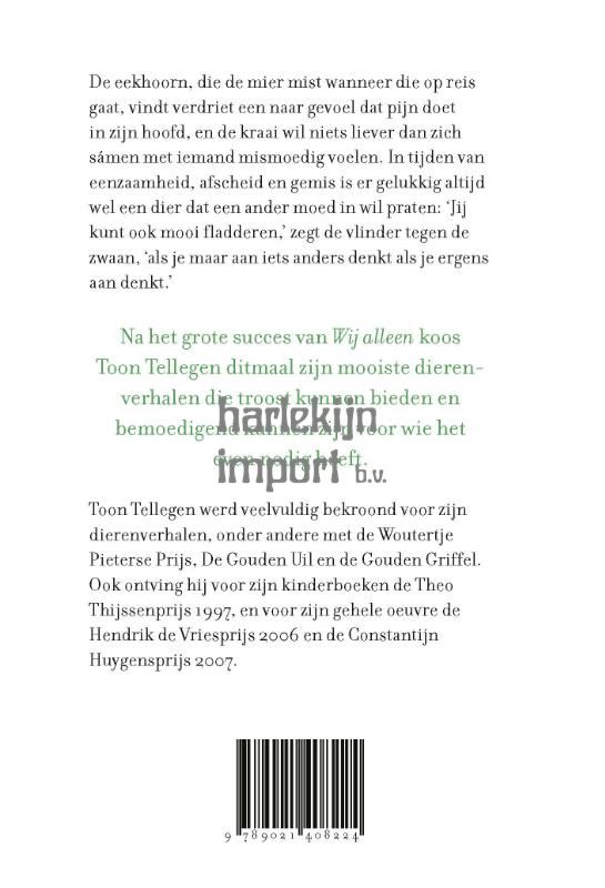 Na het grote succes van Wij alleen, waarvan binnen enkele maanden meer dan 20 000 exemplaren werden verkocht, kiest Toon Tellegen nu zijn mooiste dierenverhalen die troost kunnen bieden en bemoedigend kunnen zijn voor wie het even nodig heeft. De eekhoorn, die de mier mist wanneer die op reis gaat, vindt verdriet een naar gevoel dat pijn doet in zijn hoofd, en de kraai wil niets liever dan zich eens sámen met iemand mismoedig voelen. In tijden van eenzaamheid, afscheid en gemis is er altijd wel een dier dat de ander moed in wil praten: "Jij kunt ook mooi fladderen,' zegt de vlinder tegen de zwaan, "als je maar aan iets anders denkt als je ergens aan denkt.'