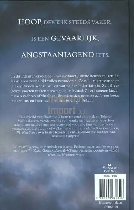 Na het verschijnen van Vrees me, Verwoest me en het auteursbezoek van Tahereh Mafi, is de Touching Juliette-trilogie niet meer weg te denken uit de Nederlandse boekhandel. Direct bij verschijnen heeft Tahereh Mafi vele harten gestolen met haar bijzondere schrijfstijl en haar indrukwekkende verhaal over Juliette, Adam en Warner. In dit tweede deel ontdekt Juliette hoe het is om voor het eerst in haar leven vrienden te maken en gewaardeerd te worden voor wie ze is en wat ze kan. Toch blijft ze twijfelen aan de juistheid van de acties van Omega Point, vooral als ze Warner beter leert kennen...