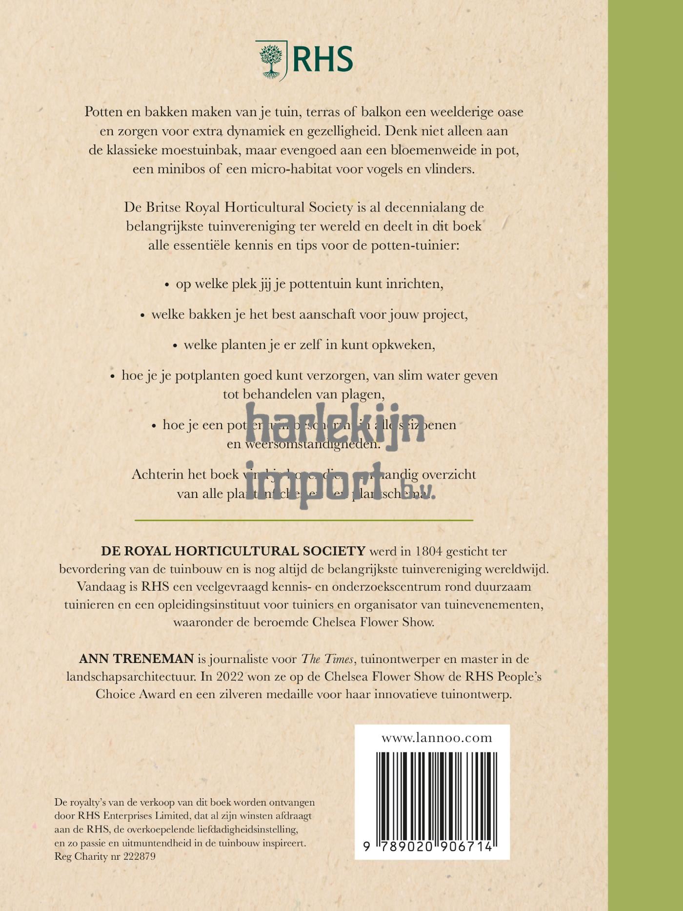 Potten en bakken maken van je tuin, terras of balkon een weelderige oase en zorgen voor extra dynamiek en gezelligheid. Denk niet alleen aan de klassieke moestuinbak, maar evengoed aan een bloemen weide in pot, een minibos of een micro-habitat voor vogels en vlinders. De Britse Royal Horticultural Society is al decennialang de belangrijkste tuinvereniging ter wereld en deelt in dit boek alle essentiƫle kennis en tips voor de potten-tuinier: op welke plek jij je pottentuin kunt inrichten, welke bakken je het best aanschaft voor jouw project, welke planten je er zelf in kunt opkweken, hoe je je potplanten goed kunt verzorgen, van slim water geven tot behandelen van plagen, hoe je een pottentuin beschermt in alle seizoenen en weersomstandigheden. Achterin het boek vind je bovendien een handig overzicht van alle plantenfiches en een plantschema.