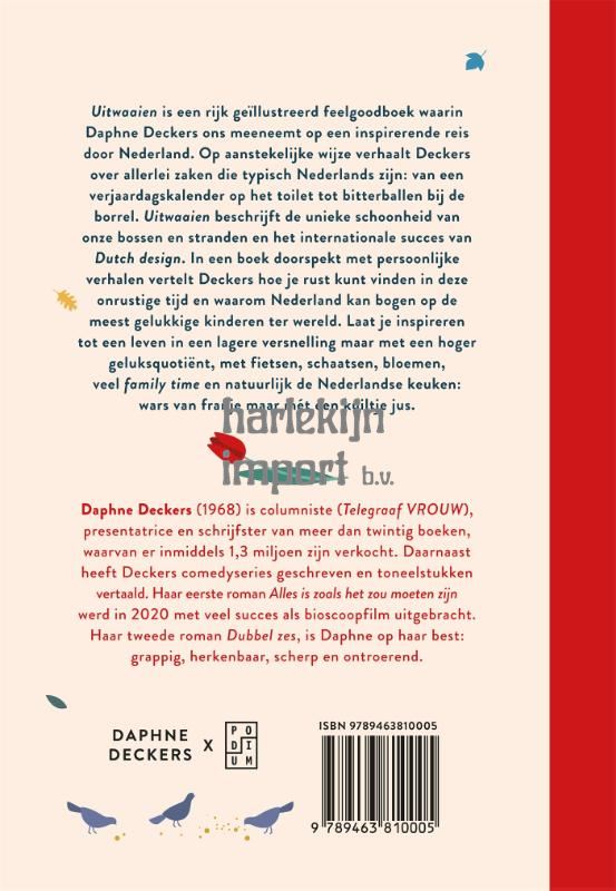 Uitwaaien is een rijk geïllustreerd feelgoodboek waarin Daphne Deckers ons meeneemt op een inspirerende reis door Nederland. Op aanstekelijke wijze verhaalt Deckers over allerlei zaken die typisch Nederlands zijn: van een verjaardagskalender op het toilet tot bitterballen bij de borrel. Uitwaaien beschrijft de unieke schoonheid van onze bossen en stranden en het internationale succes van Dutch design. In een boek dat is doorspekt met persoonlijke verhalen vertelt Deckers hoe je rust kunt vinden in deze onrustige tijd en waarom Nederland kan bogen op de meest gelukkige kinderen ter wereld. Laat je inspireren tot een leven in een lagere versnelling maar met een hoger geluksquotiënt, met fietsen, schaatsen, bloemen, veel family time en natuurlijk de Nederlandse keuken: wars van franje maar mét een kuiltje jus.