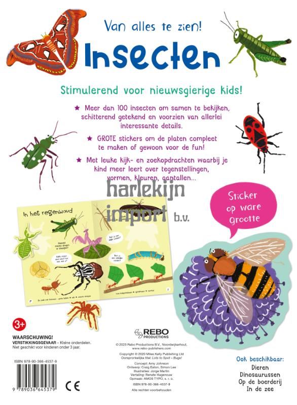 Stimulerend voor nieuwsgierige kids! Meer dan 100 insecten om samen te bekijken, schitterend getekend en voorzien van allerlei interessante details. GROTE stickers om de dierenplaten compleet te maken of gewoon voor de fun! Met leuke kijk- en zoekopdrachten waarbij je kind meer leert over tegenstellingen, vormen, kleuren, aantallen...