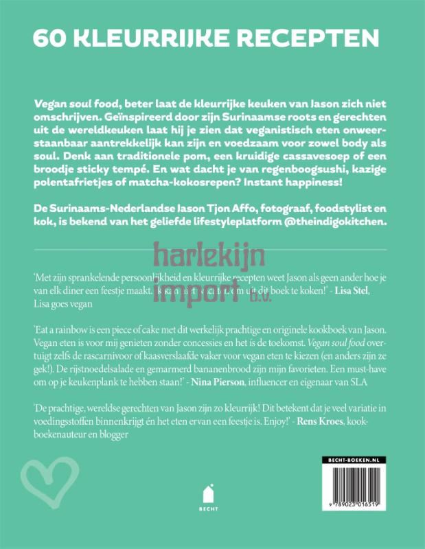 'Vegan Soul Food' won in 2020 de prijs voor het Beste Vegan Kookboek van het jaar en is daarmee een boek dat in geen enkele plantaardige keuken mag ontbreken! Vegan soul food - beter laat de kleurrijke keuken van Jason Tjon Affo zich niet omschrijven. Geïnspireerd door zijn Surinaamse roots en gerechten uit de wereldkeuken laat hij je zien dat veganistisch eten onweerstaanbaar aantrekkelijk kan zijn, en ook voedzaam voor zowel body als soul. Denk aan traditionele pom, een kruidige cassavesoep of een troostrijke rijstbowl in Japanse stijl. En wat dacht je van een broodje pikante sticky tempé, of een kom verwarmende havermout met blauwe bessen en bakbanaan? Allemaal vegan en superlekker! Jason Tjon Affo - online beter bekend als The Indigo Kitchen - heeft duizenden volgers die uitkijken naar zijn kleurrijke creaties. Zijn gerechten zijn namelijk niet alleen overheerlijk, maar ook ware blikvangers. Van ontbijtjes, drankjes en broodjes tot uitgebreide diners, snacks en zoete lekkernijen: al zijn boeken staan boordevol verleidelijke en verrassende vegan recepten voor ieder moment van de dag. 'Met zijn sprankelende persoonlijkheid en kleurrijke recepten weet Jason als geen ander hoe je van elk diner een feestje maakt. Ik kan niet wachten om uit dit boek te koken!' - Lisa Stel, Lisa goes vegan 'Eat a rainbow is a piece of cake met dit werkelijk prachtige én originele kookboek van Jason. Vegan eten is voor mij genieten zonder consessies en het ís de toekomst. Vegan soul food overtuigt zelfs de rascarnivoor of kaasverslaafde vaker voor vegan eten te kiezen (en anders zijn ze gek!). De regenboogmaki, rijstnoedelsalade en gemarmerd bananenbrood zijn mijn favorieten. Een must have om op je keukenplank te hebben staan!' - Nina Pierson, influencer en eigenaar van saladadebarketen SLA 'De prachtige, wereldse gerechten van Jason zijn zo kleurrijk! Dit betekent dat je veel variatie in voedingsstoffen binnenkrijgt én het eten ervan een feestje is. Enjoy!' - Rens Kroes, kookboekenauteur en blogger