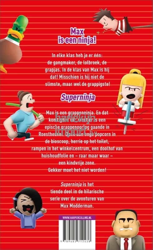 Deel 10 in de serie: een nieuw avontuur voor Max Modderman en zijn vrienden.Max is een grappenninja. En dat komt goed uit, want er is een epische grappenoorlog gaande in Roestheuvel. Denk aan enge popcorn in de bioscoop, herrie op het toilet, rampen in het winkelcentrum, een doolhof van huishoudfolie en – raar maar waar – een kindvrije zone. Gekker moet het niet worden!Lezersreacties:‘De boeken over Max Modderman zijn grappig, niet alleen door de gebeurtenissen, maar ook door het taalgebruik. Complimenten voor de vertaler: Angelique Verheijen.’‘Gewoonweg hilarisch. Ik heb alle boeken tot nu toe voorgelezen in de klas. De leerlingen vinden het geweldige verhalen.’