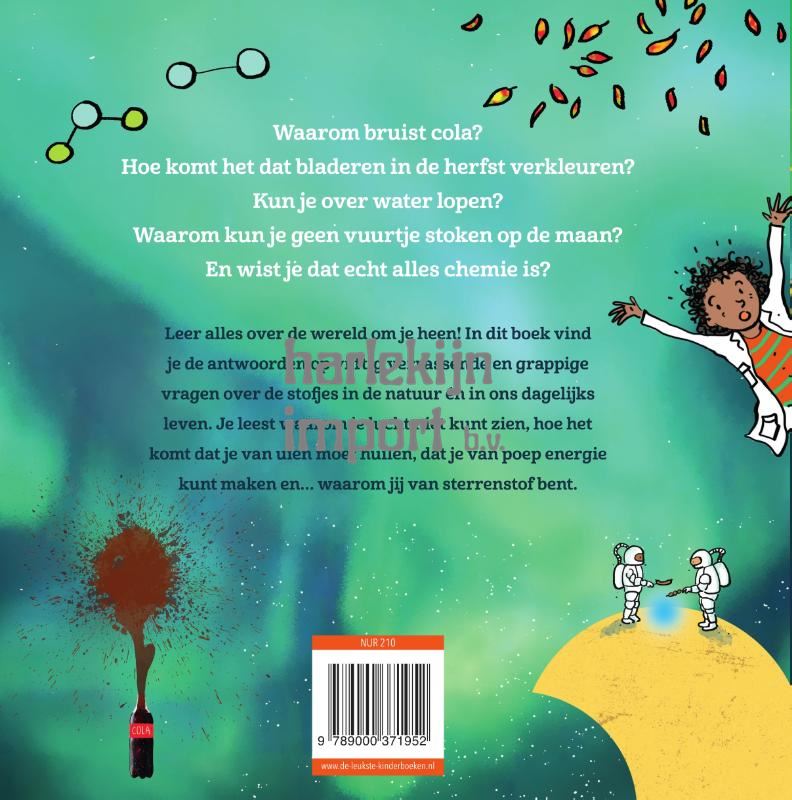 Waarom bruist cola en waarom kun je geen vuurtje stoken op de maan? Voor fans van Topdoks, Checkpoint en Willem Wever. Hoe komt het dat bladeren in de herfst van kleur veranderen? Kun je over water lopen? En wist je dat we allemaal uit sterrenstof bestaan? Gezondheidswetenschapper Esther Walraven brengt een nieuw weetjesboek, ditmaal rond het thema scheikunde. Ze bespreekt in korte hoofdstukken vijftig verschillende onderwerpen die te maken hebben met 'stofjes in de natuur en in ons dagelijks leven', op de vlotte, heldere manier die we van haar gewend zijn. Een boek over scheikunde is natuurlijk niet compleet zonder de nodige experimenten en proefjes. En als kers op de taart maakte Iris Boter de vrolijke, grappige illustraties. 'Esther Walraven schrijft in begrijpelijke taal, zonder kinderachtig te worden. Het lijkt soms net alsof je afleveringen van Het Klokhuis op papier leest. Fijn is ook dat het boek nergens belerend is.' Leesfeest.nl