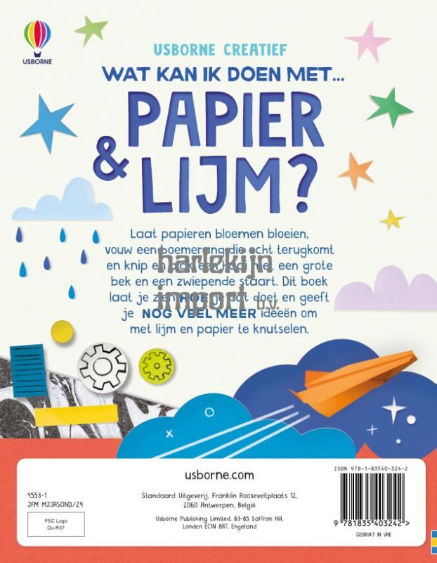 Met papier en lijm kun je verrassend veel dingen doen en maken. Papieren honden racen van een heuvel af, je vouwt gigantische vlinders van oud cadeaupapier en ontdekt manieren om geheime boodschappen te verstoppen en vinden. Hoe kun je papier marmeren? Hoe verander je twee papieren bekers in een draaiende tijdmachine? Heb je weleens een geheim recept voor lijmplaneten gezien? En als je de eenvoudige stap-voor-stap instructies volgt, kun je een haai uitknippen, vouwen en in elkaar plakken die kan buigen en met zijn staart kan slaan.