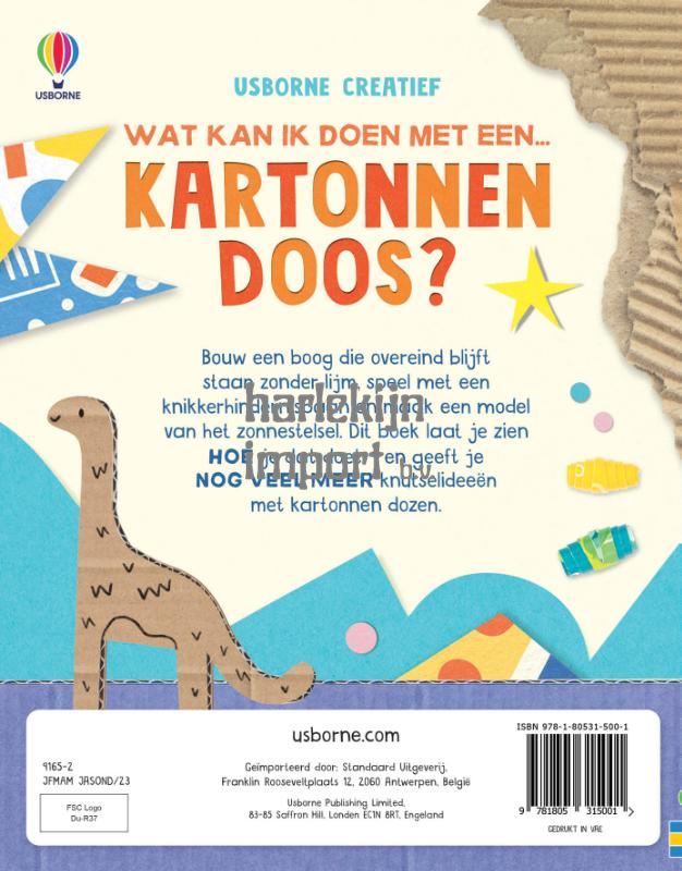 Ontdek geniale nieuwe dingen die je met kartonnen dozen kunt doen. Bouw je eigen minidorp, maak een monster van een tissuedoosje en rol kralen van stevig, kleurig karton. Bij de projecten worden alleen kindvriendelijke methodes gebruikt, dus er komt geen mes aan te pas. Voor het aanmoedigen van de fantasie, creativiteit en concentratie.