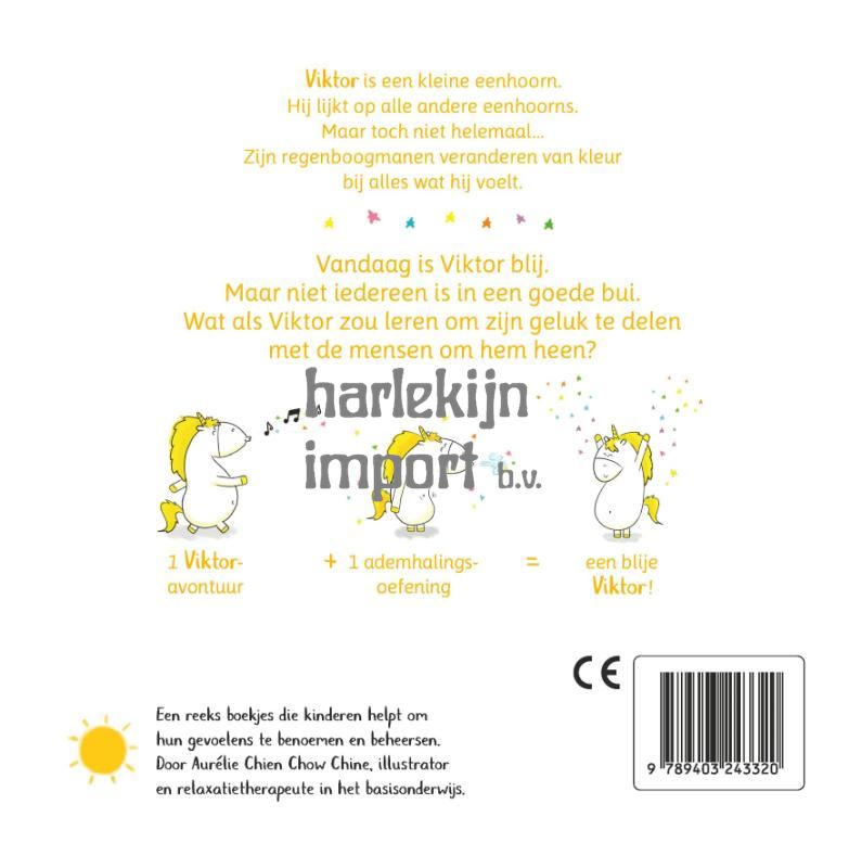 Viktor is een kleine eenhoorn, net als alle andere, of toch bijna... Zijn regenboogmanen veranderen van kleur naargelang zijn emoties!Vandaag is Viktor vrolijk. Maar niet iedereen voelt zich even goed. Wat als Viktor zou leren om zijn geluk te delen met de mensen om hem heen?Aan het einde van het verhaal volgt een ademhalingsoefening om kinderen te helpen hun emoties te beheersen.