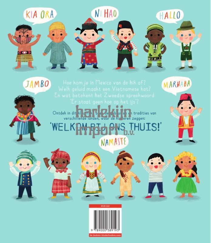 Wat drinken kinderen in Ethiopië? Welk geluid maakt een Vietnamese kat? En wat betekent het Zweedse spreekwoord ‘Er staat geen koe op het ijs’? Ontdek alles – de verschillen, maar ook de overeenkomsten – over het leven van kinderen in andere landen in Welkom bij ons thuis. Lees samen met je kleuter met welk speelgoed kinderen van Nepal tot Mexico spelen, of leer een traditioneel Ghanees spelletje voor op het schoolplein. En als het uit is? Dan zeg je Arrivederci – in Italië tenminste! Een prachtig kleurrijk boek dat kinderen leert om naar elkaar te kijken in harmonie en met respect, perfect voor het onderwijs, om samen met je kind te lezen, of om zelf te lezen!
